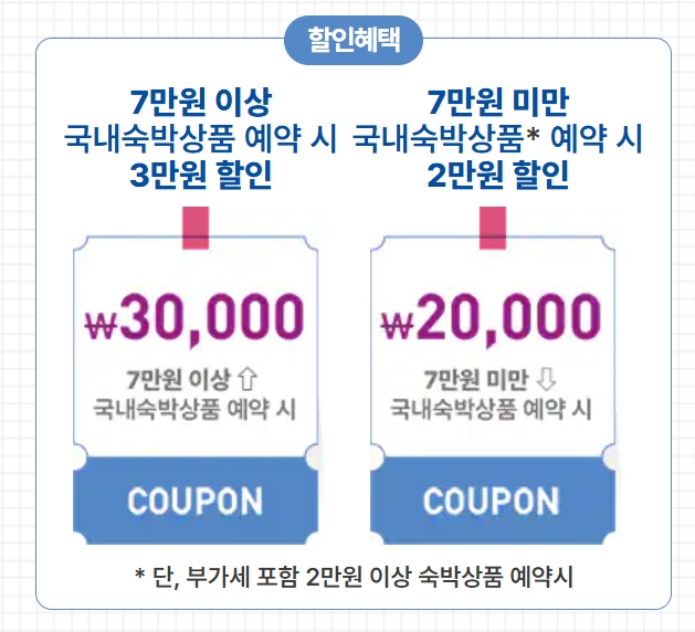 - 3만원 할인: 7만원 이상 국내숙박상품 예약 시 3만원 할인